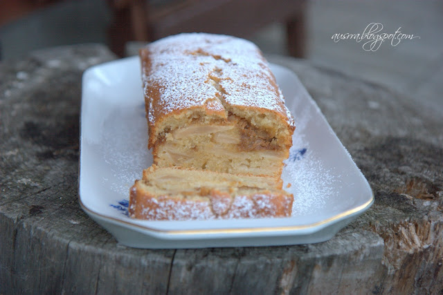 Obuolius nulupame, išpjauname sėklalizdžius. Supjaustome obuolius skiltelėmis ir apšlakstome citrinos sultimis, kad neruduotų. Minkštą sviestą ištriname cukrumi iki purumo. Po vieną įmušame kiaušinius ir gerai išmaišome. Supilame jogurtą. Miltus sumaišome su kepimo milteliais ir vaniliniu cukrumi. Maišydami po truputį juos beriame į sviesto ir cukraus masę. Pusę tešlos sukrečiame į kepimo popieriumi išklotą stačiakampę kekso formą. Išdėliojame obuolių skilteles, ant jų užberiame susmulkintą chalvą, o ant viršaus – likusią tešlą. Kepame iki 180 °C temperatūros įkaitintoje orkaitėje apie 45–50 min. Iškepusį pyragą atvėsiname ir pabarstome milteliniu cukrumi. Dar šiltas labai gardus su ledais.