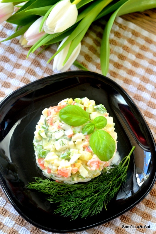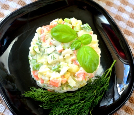 Krabų lazdeles susmulkiname kubeliais, agurką ir kiaušinius taip pat susmulkiname vienodo dydžio kubeliais. Žalumynus susmulkiname. Beriame prieskonius, dedame majonezo ir gerai išmaišome.