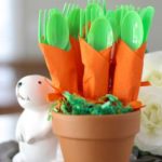 - Įrankius Velykų stalui visuomet padedate prie lėkščių? O šį kartą sudėkite juos į vieną vazonėlį, apvyniokite oranžine servetėle – bus stilizuotos morkytės.
