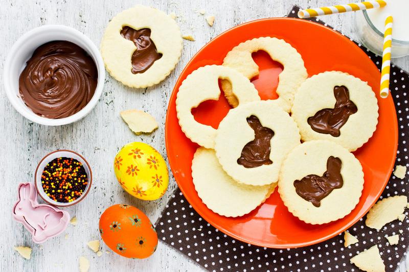 Išėmę iškočiokite ir išpjaukite apvalius, vienodo dydžio skrituliukus. Kas antrame jų įspauskite kiškio formelę. Sausainiai turėtų būti 0,5 cm storio. Kepkite kepimo popieriumi išklotoje skardoje 7–12 min. iki 180 °C įkaitintoje orkaitėje. Iškeptus sausainius patepkite šokoladiniu kremu ir ant viršaus dėkite sausainį su zuikio forma.