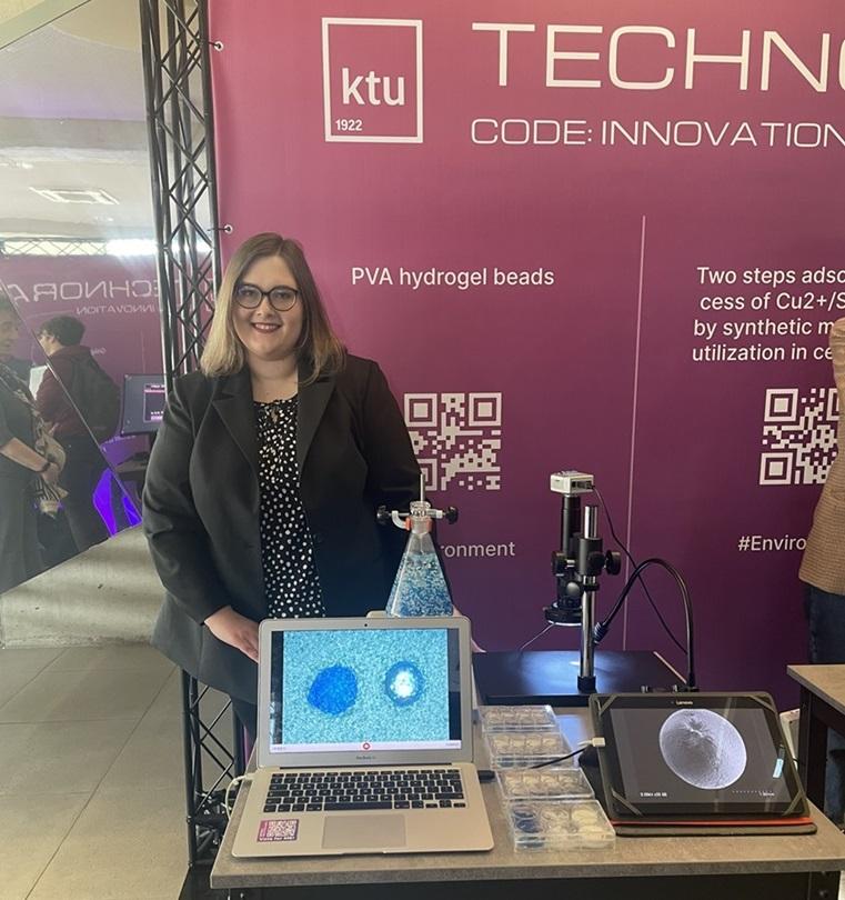 KTU Aplinkosaugos inžinerijos magistrė Judita Švaikauskaitė, studijų metu gaminusi ir tyrinėjusi iš polivinilo alkoholio gaminamas hidrogelio granules, džiaugiasi, kad turinčios unikalią savybę – labai porėtą struktūrą – medžiagos gali būti pritaikytos mikroteršalams šalinti iš užteršto vandens. „Aplinkosaugos srityje matau didžiulį potencialą ir daug neatidėliotinų iššūkių, kuriuos turime spręsti nedelsdami“, – teigia Judita.