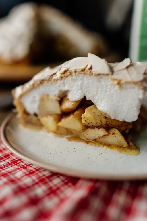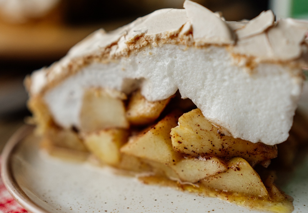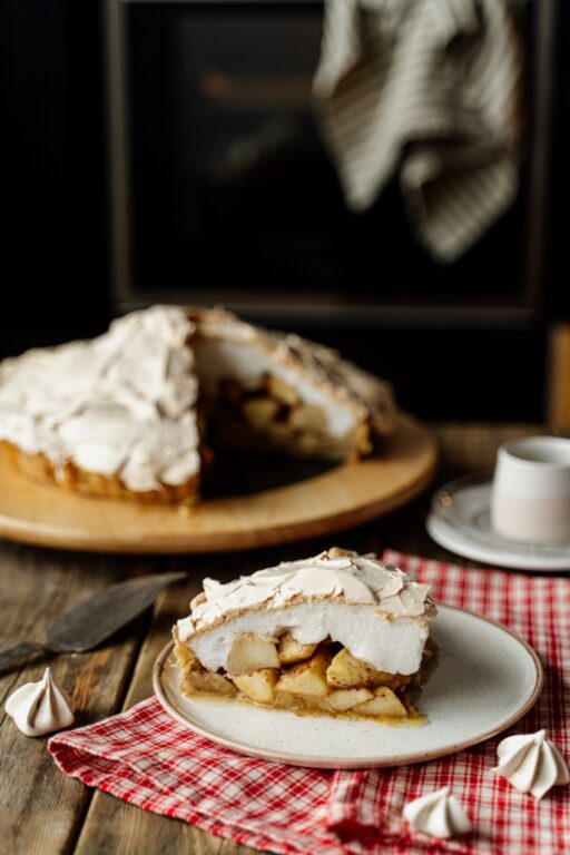 Ant obuolių paskleiskite šią masę, išlyginkite paviršių. Įdėkite obuolių pyragą į orkaitę ir kepkite 50–60 minučių. Morengas turi būti traškus iš viršaus ir minkštas iš vidaus, tešlos pluta visiškai iškepusi. Jei morengas nėra traškus, galite kepti dar 10 minučių. Prieš pjaustydami palaukite, kol atvės.