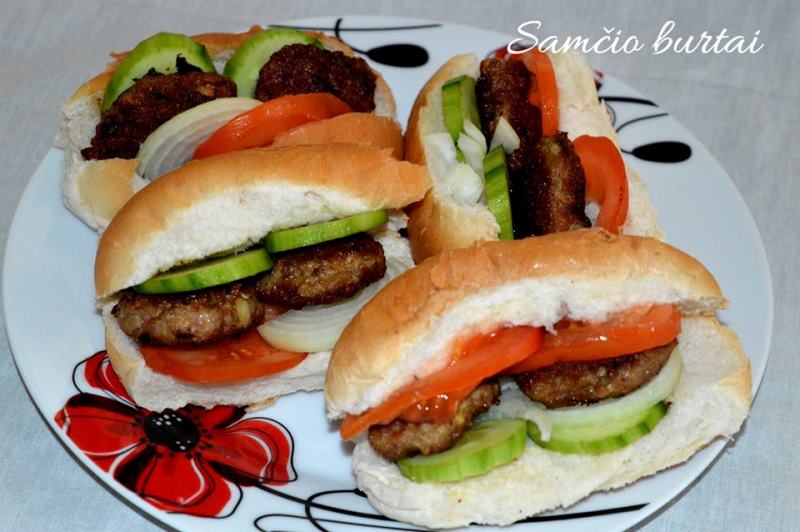 Į bandeles dedame po 2 kotletukus ir plonomis riekelėmis pjaustytų daržovių. Jeigu norite, galite užpilti norimo padažo.