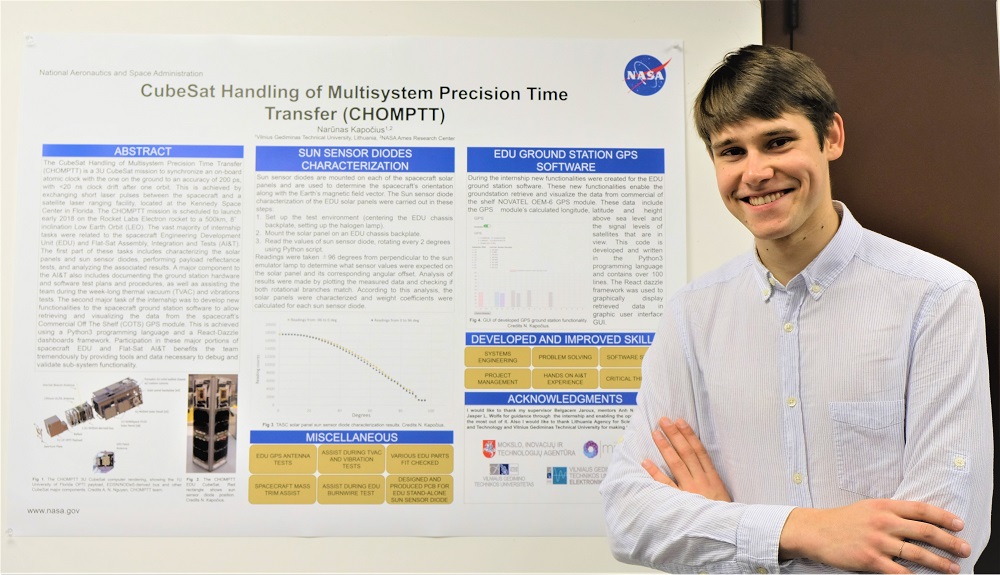 Narūnas Kapočius, VGTU Telekomunikacijos inžinerijos 4 kurso studentas, neseniai atlikęs stažuotę NASA Ameso tyrimų centre, dalijasi įspūdžiais ir rezultatais, kuriuos pavyko pasiekti. Anot jo, Lietuva yra gerai žinoma NASA dėl mūsų palydovų kūrėjų įmonės „Nanoavionics“ veiklos. Ne vienas pirmą kartą sutiktas NASA darbuotojas, priėjęs prie studento ir išgirdęs, kad jis iš Lietuvos, pasakė, kad žino mūsų šalį ir vertina ją kaip lyderiaujančią naujai atsirandančiame kosmoso segmente – mažųjų palydovų segmente.