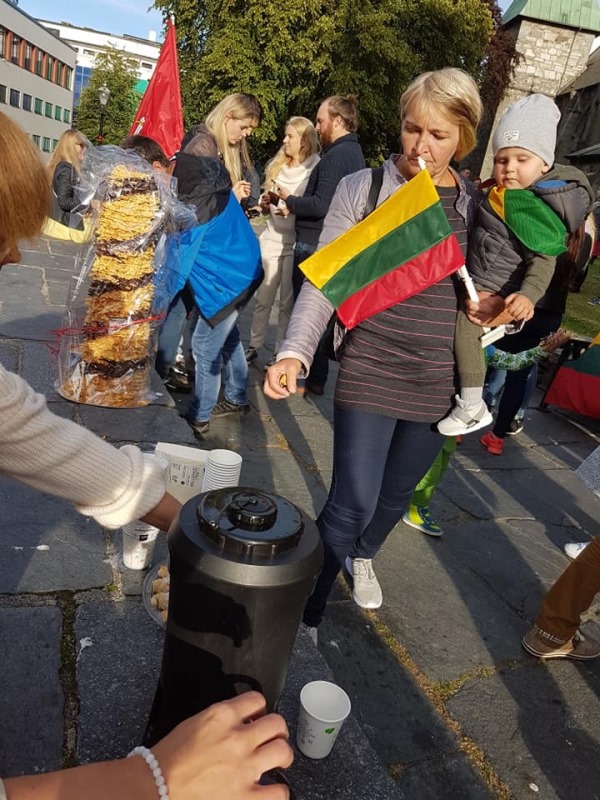 Sugiedoję himną visi įsiamžino bendroje nuotraukoje. Žmonės nesiskirstė, Rogalando lietuvių bendrija vaišino kava, arbata, saldėsiais. Didžiulį šakotį visiems dovanojo Rolandas Lenkimas. Kaip tik šiandien buvo kelių dalyvių gimtadieniai. Švenčiantiems visi kartu sudainavo „Ilgiausių metų“. Giedant himną dirigavo Rogalando choro „Oktava“ vadovė Lina Vingienė. Filmavo Julius Miltenis.