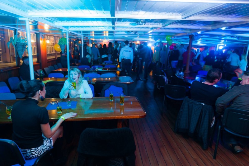 Vos tik atėjusius į laivą žmones pirmiausia pasitikdavo kiek neįprastas aukštas slenkstis. Ne vieną mažiau atidų ar nesivarginantį pakelti kojos jis pirmas ir pasveikindavo, o kai kuriuos ir labai įtaigiai. Palikę striukes laivo prieangyje (tambūre) įrengtose kompaktiškose rūbinėse, vakaro dalyviai kopė besisukančiais laiptais į viršų, prisilietė prie riestų, daug mačiusių, jūros vėjų nugairintų ir sūrių bangų purslų aptaškytų ąžuolinių turėklų. Kaktomuša susidūrė su ant sienos kabančia Lietuvos trispalve. Pasukę siauru koridoriumi ir tik įžengę į salę, išvydo geltonos, žalios ir raudonos spalvų balionus, išdėstytus Lietuvos vėliavos spalvų eiliškumu. Išgirdę muziką, pasukdavo galvas į garso pultą, o ten į juos žvelgė raitelis ant žirgo – istorinė Lietuvos vėliava – vytis.