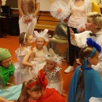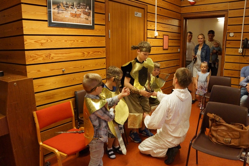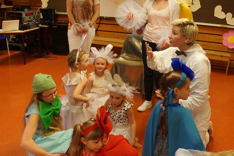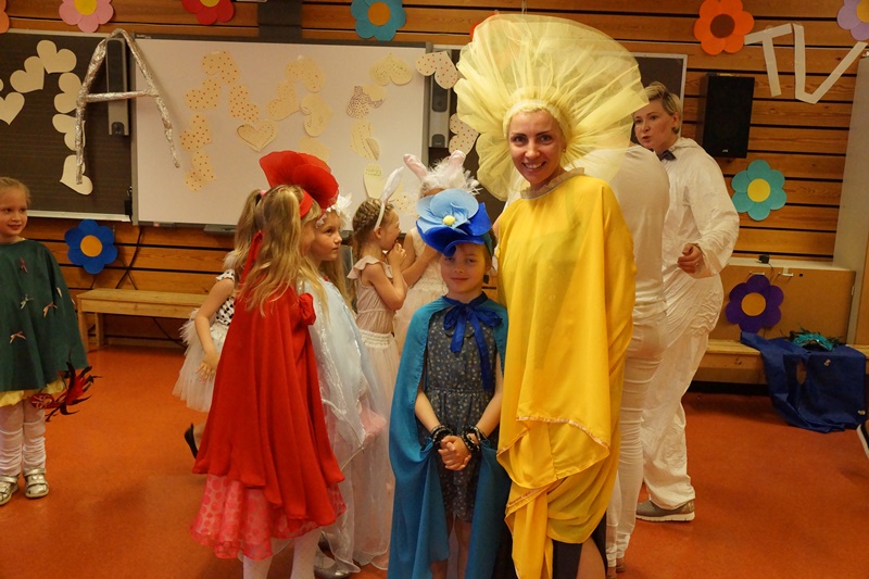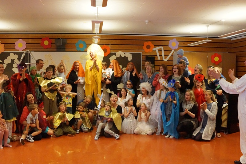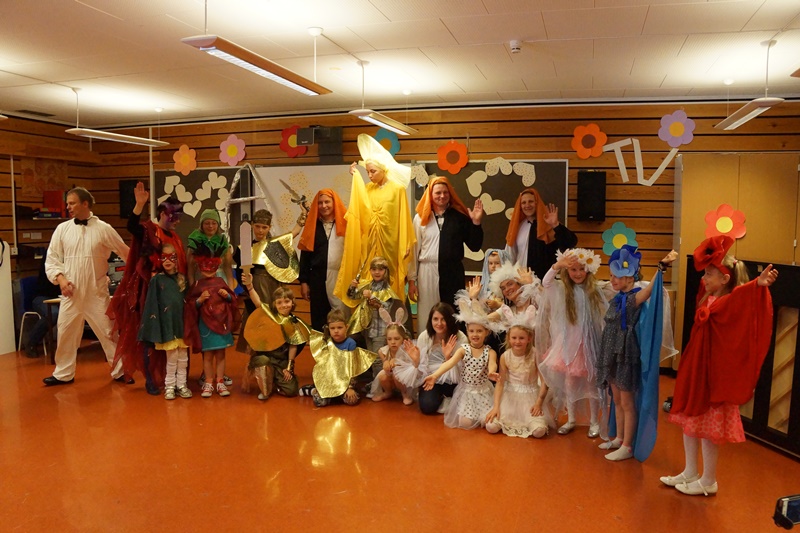 11 valandą pakilios nuotaikos vaikai ir tėveliai rinkosi į Maudlando mokyklą Hommersake. Visi nekantriai laukė aktorių iš Lietuvos pasirodymo. Pradžioje vyko sulėktuvių repeticija. Kai ši užduotis buvo įvykdyta ir šokis buvo sušoktas, prasidėjo pasakos „Saulės išvadavimas“ repeticija. Žiūrovai tapo dalyviais. Matavosi, rengėsi įvairiausius kostiumus, kartojo vaidmenų veiksmus ir užduotis. Visiems pasiruošus scenoje patekėjo saulė. Ji negailėdama žarstė šviesius gerumo spindulius, kur tik surado gyvybę. Scenoje besisukdamos išdygo aguona, ramunė. Nykštukas blaškydamasis barstė gėrio sėklas. Atbėgo kiškučiai su kiškiene, egzotiški paukščiai su paukšte. Ir staiga šią harmoniją nutraukė baisios trigalvės pabaisos riaumojimas. Pabaisa išblaškė visą gražiąją kūriniją ir įkalino saulę. Bet kur buvę, kur nebuvę atjojo karžygiai ir susikovė su pabaisa. Vytys ant jų krūtinių žadino protėvių narsą. Jie nugalėjo pabaisą ir išlaisvino saulę. Išleidęs paskutinį atodūsį, pabaisa virto trimis geraisiais fėjinais. Ir šviesa vėl pasklido po pasaulį.