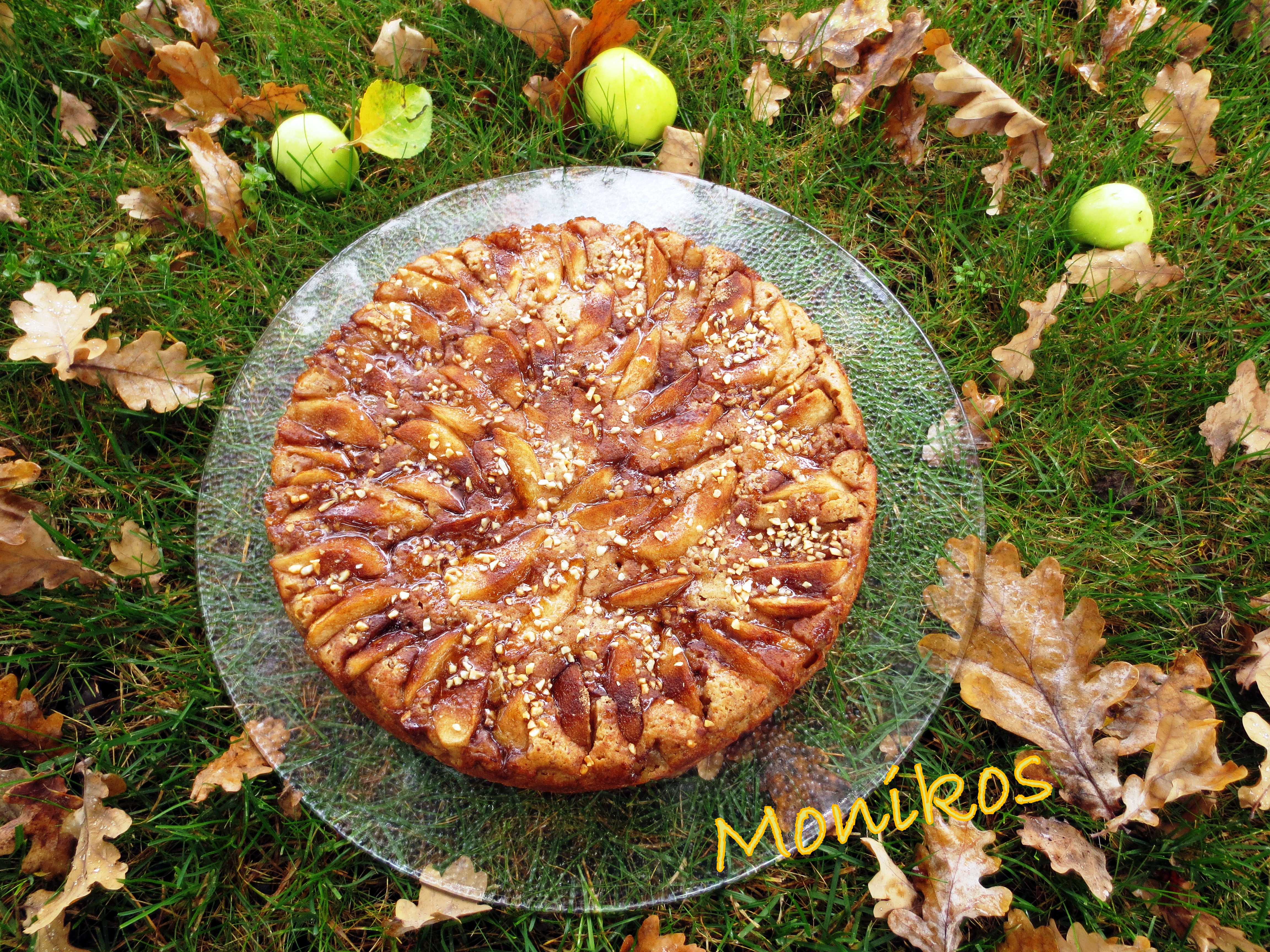 Tešlą supilame į kepimo formą, išlyginame. Gražiai dėliodami vieną prie kitos į tešlą susmeigiame obuolių skilteles.