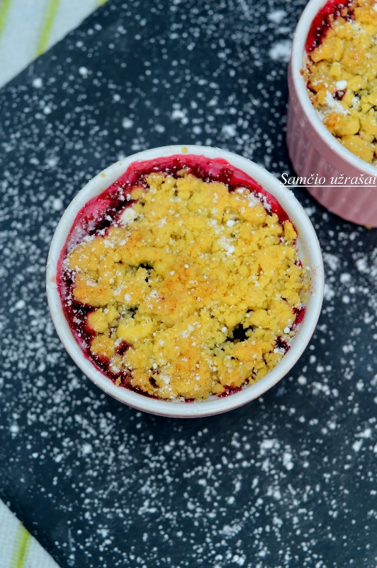 Kepimo indelius ištepkite sviestu, dėkite ⅔ indelio tūrio obuolių ir uogų masės ir gausiai užberkite trupinukais.