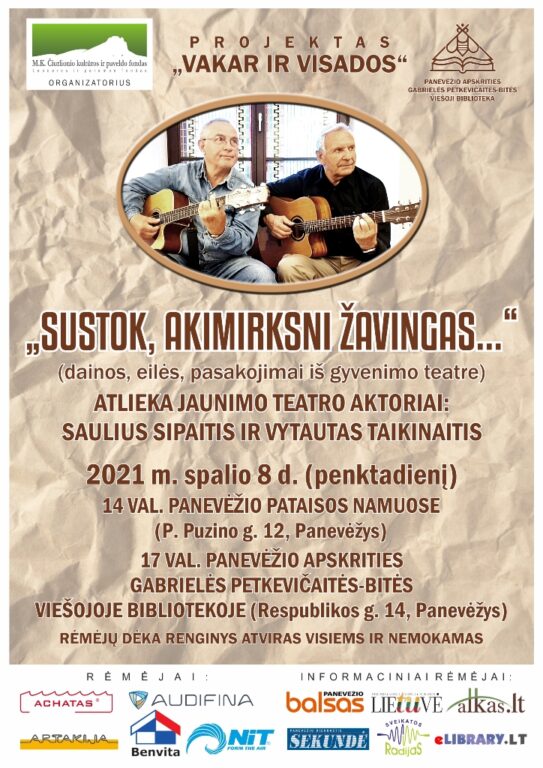 M. K. Čiurlionio kultūros ir paveldo fondas 2021 m. spalio 8 d. (penktadienį) 14 val. Panevėžio pataisos namuose (P. Puzino g. 12, Panevėžys) ir 17 val. Panevėžio apskrities Gabrielės Petkevičaitės-Bitės viešojoje bibliotekoje (Respublikos g. 14, Panevėžys) rengia Jaunimo teatro aktorių Sauliaus Sipaičio ir Vytauto Taukinaičio sukurtą visiškai naują programą „SUSTOK, AKIMIRKSNI ŽAVINGAS“.