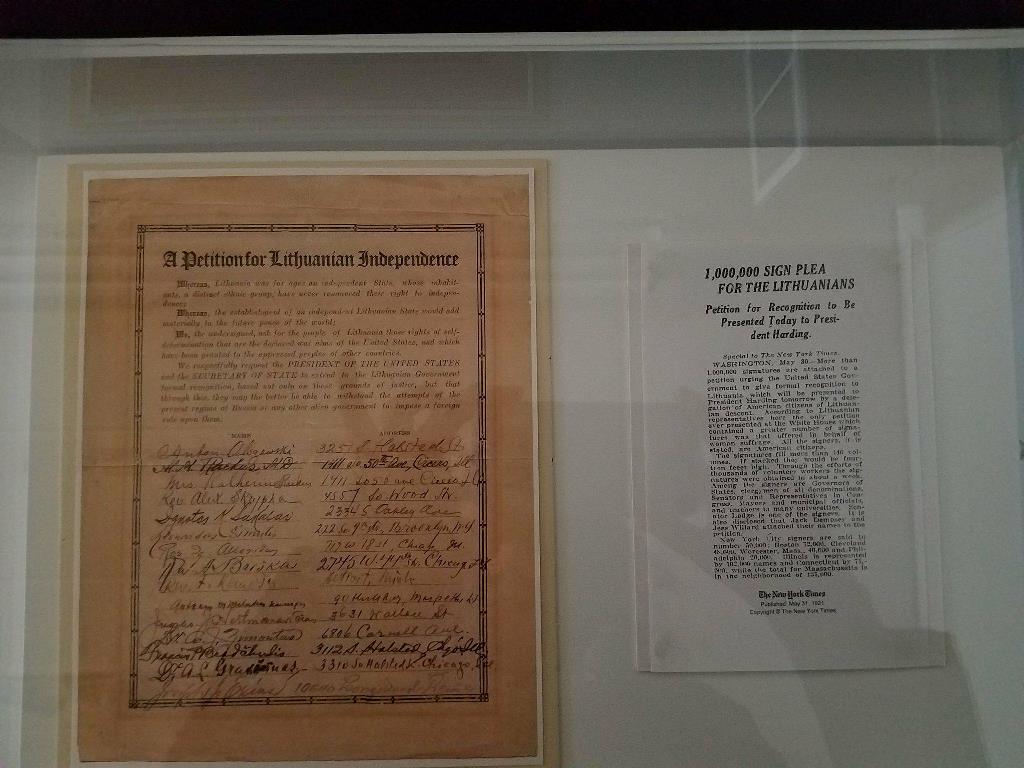 Panašu, kad parodos rengėjai susidūrė ir su netikėta istorijos mįsle: neatmetama, kad 1921 metais Amerikoje surinktas milijonas parašų peticijai už 1918 metais paskelbtos Lietuvos valstybės pripažinimą galėjo neišlikti JAV archyvuose. Tuomet gegužės 31 dieną „New York Times“ rašė, kad po peticija pasirašiusių lietuvių ir amerikiečių pavardės buvo surašytos į 140 knygų, kurias sudėjus vieną ant kitos susidarytų 14 pėdų (daugiau nei 4 metrų) aukščio stirta. Lietuvių veikėjų delegacija tas knygas su parašais įteikė JAV Prezidentui Warrenui G. Hardingui (Warren G. Harding). Parodoje eksponuojama šios istorinės delegacijos nuotrauka.