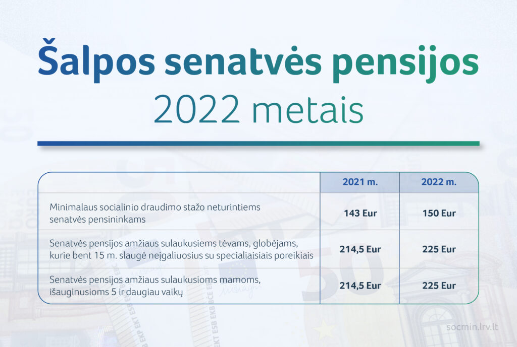 Minimalaus socialinio draudimo stažo neturintiems senatvės pensininkams šalpos senatvės pensija didės nuo 143 eurų iki 150 eurų; senatvės pensijos sulaukusiems tėvams, globėjams, kurie bent 15 metų slaugė neįgaliuosius, turinčius specialiųjų poreikių, – nuo 214,5 euro iki 225 eurų; senatvės pensijos amžiaus sulaukusioms mamoms, išauginusioms penkis ir daugiau vaikų, – nuo 214,5 euro iki 225 eurų.