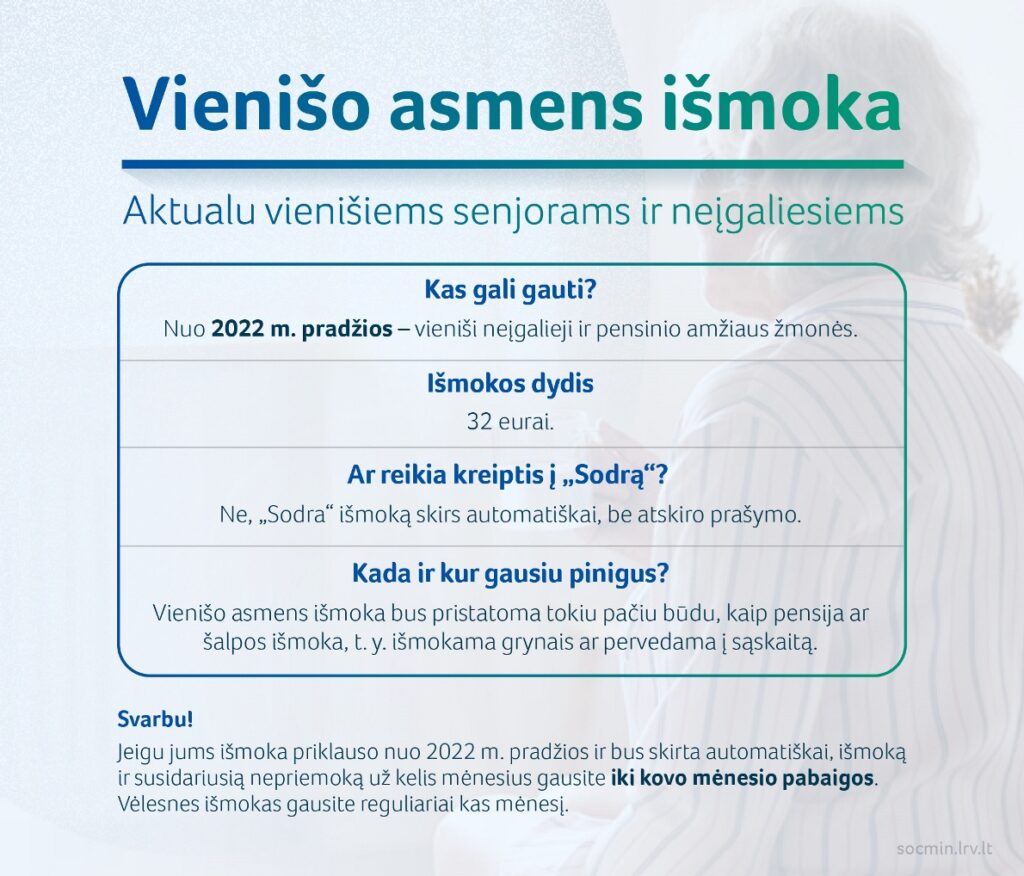 Kitąmet vienišo asmens išmoka bus skiriama automatiškai ir mokama be atskiro asmens prašymo, o ją gaus beveik penkis kartus daugiau šalies gyventojų. Pirmosios išmokos kartu su susidariusia nepriemoka pasieks gavėjus ne vėliau kaip kovo mėnesį.