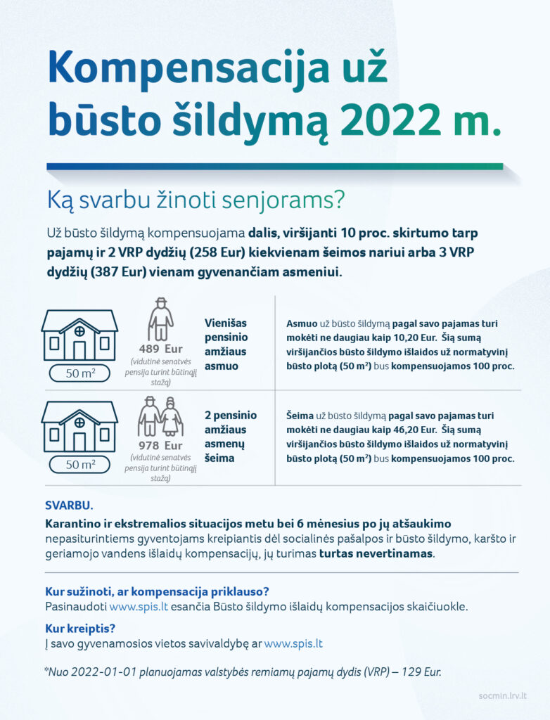 Pakeitus būsto šildymo išlaidų kompensacijos apskaičiavimo metodiką, nuo kitų metų kompensaciją už būsto šildymą gaus daugiau nepasiturinčių šalies gyventojų, įskaitant ir senjorus. Pavyzdžiui, vienas gyvenantis senjoras gauna 489 eurų senatvės pensiją turėdamas būtinąjį stažą. Pritaikius naują metodiką, jis pagal savo pajamas turės mokėti ne daugiau kaip 10,2 euro. Šią sumą viršijančios būsto šildymo išlaidos už normatyvinį būsto plotą (50 kv./m) jam bus kompensuojamos 100 proc.