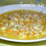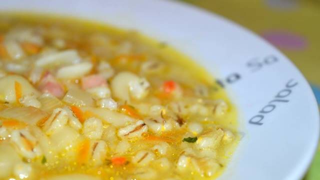 Į sultinį suberiame perlines kruopas ir verdame. Įkaitintame aliejuje kepiname smulkintą svogūną, pievagrybius ir tarkuotą morką. Verčiame į sriubą. Pakepiname smulkintą šoninę ir spirgiukus suberiame į sriubą. Sudedame makaronus ir verdame, kol šie išverda. Beriame druskos. Sriuba išeina tirštoka. Galite vietoje perlinių kruopų naudoti pupeles.