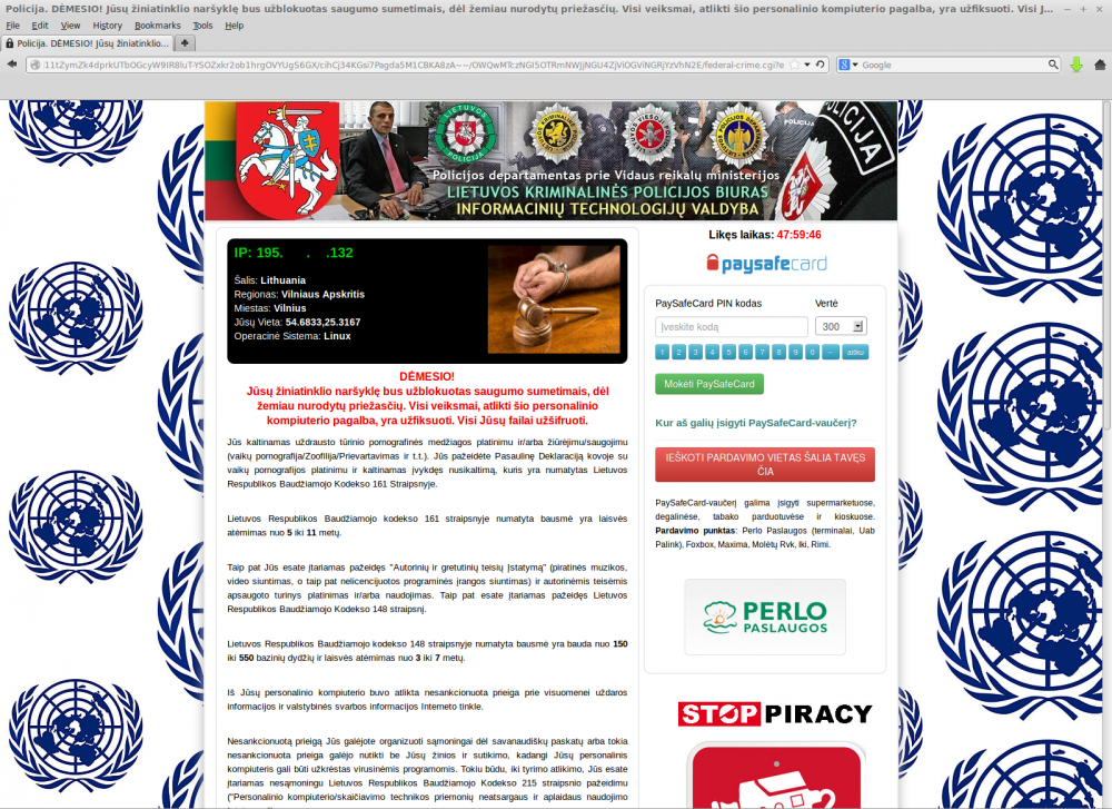 CERT-LT atkreipia dėmesį, kad teisėsaugos institucijos ir kitos valstybinės organizacijos neblokuoja interneto naudotojų kompiuterių ir neprašo sumokėti baudos tokiomis priemonėmis, kaip yra pateikiama fiktyviuose pranešimuose.