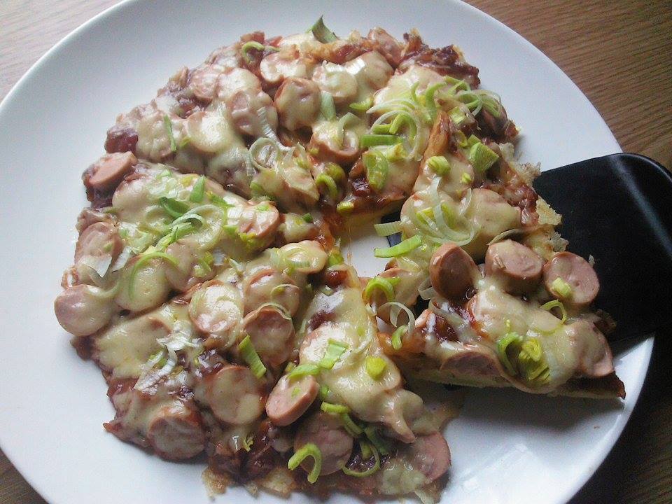 Tešlą pilti į įkaitintą keptuvę su lašeliu aliejaus, tada sumažinti ugnį iki minimumo, uždengti dangčiu, pakepti 3–4 min. Nuimti dangtį, tada sudėti su sviestu ar aliejumi pakepintą smulkiai pjaustytą svogūną, česnaką, supilti kečupą, dėti dešreles, berti tarkuotą sūrį, įvairius žalumynus. Kepti uždengus dangčiu, kol ištirps sūris.
