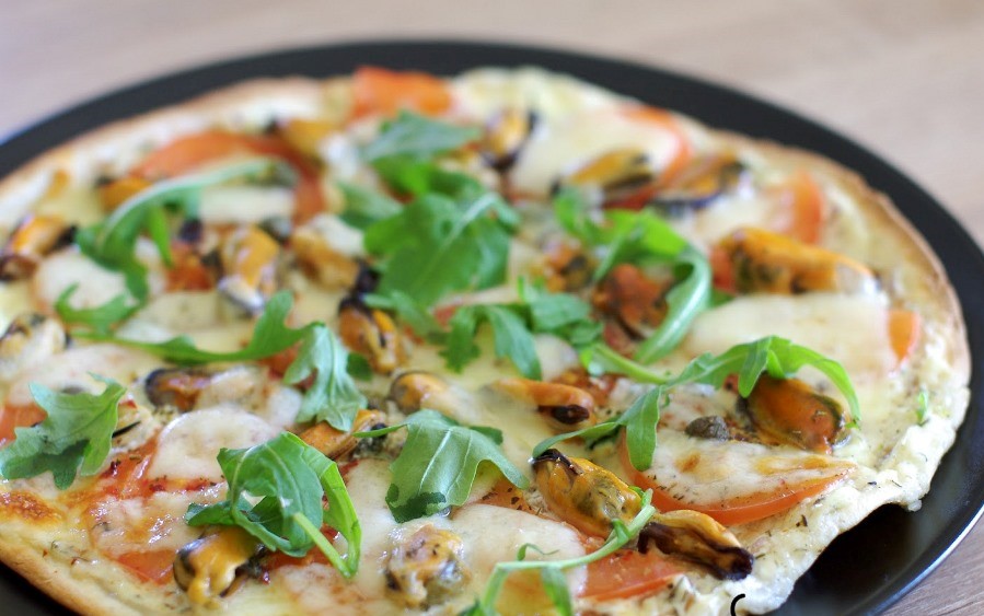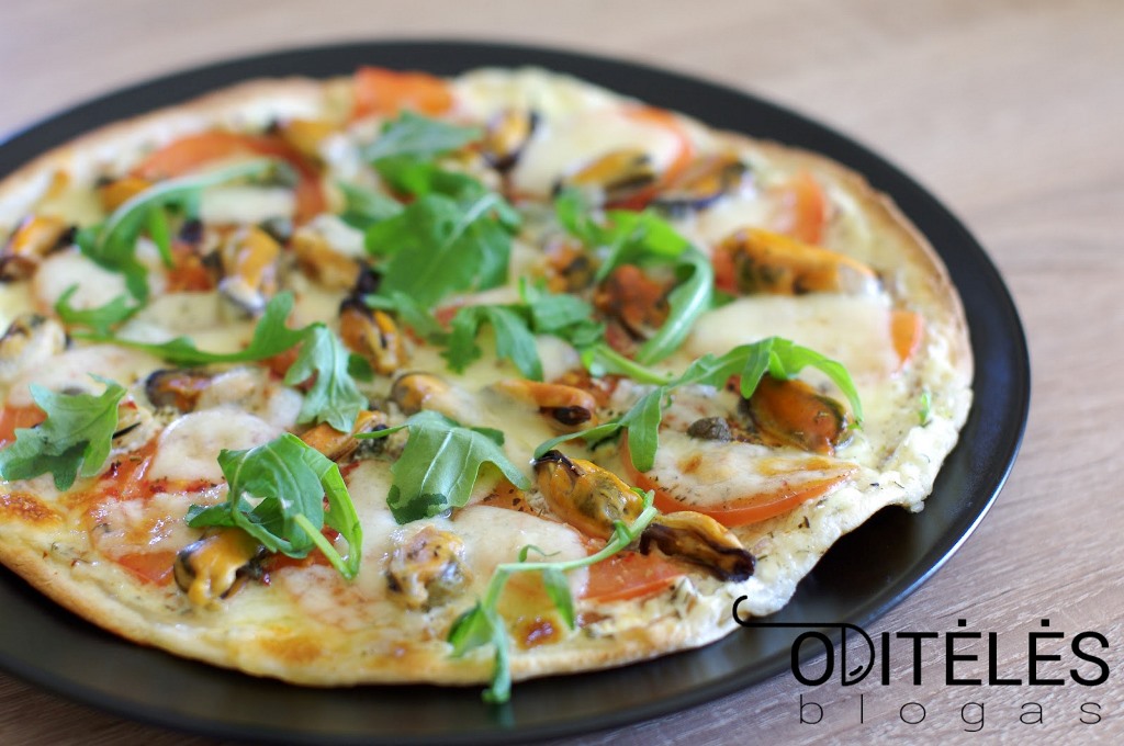 Picos padus ištepkite paruoštu padažu. Tuomet išdėliokite plonais pusžiedžiais pjaustytą pomidorą, dėkite midijas, berkite picų prieskonius, aitriąsias paprikas ir išdėliokite mocarelos sūrį.