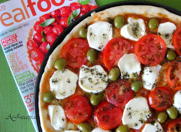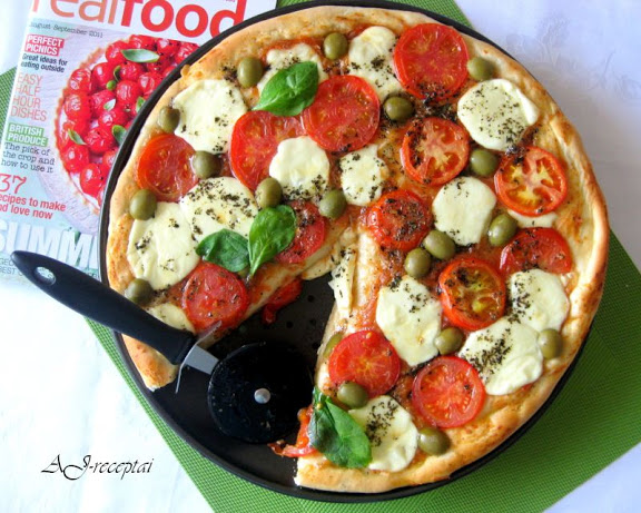Pakilusią tešlą dar kartą perminkome. Iškočiojame apie 28 cm skersmens picos pagrindą. Tepame ant jo pomidorų padažą, išdėliojame mocarelą, pomidorus. Apšlakstome aliejumi su žolelėmis. Papuošiame alyvuogėmis. Kepame 220 °C temperatūros orkaitėje apie 20 min. Skanaus!