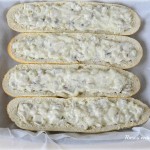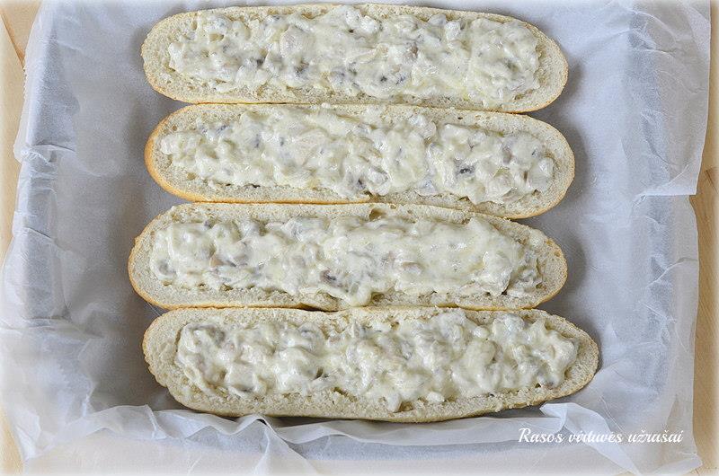 Batoną perpjaukite per pusę išilgai, išimkite iš jo minkštimą. Dėkite į kepimo indą (į kepimo indą įtieskite kepimo popierių arba foliją).