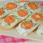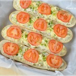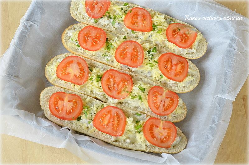 Batoną užpildykite įdaru, pabarstykite tarkuotu sūriu, užberkite smulkintų petražolių ir uždėkite pjaustytų pomidorų.