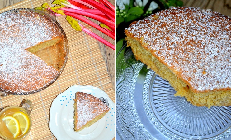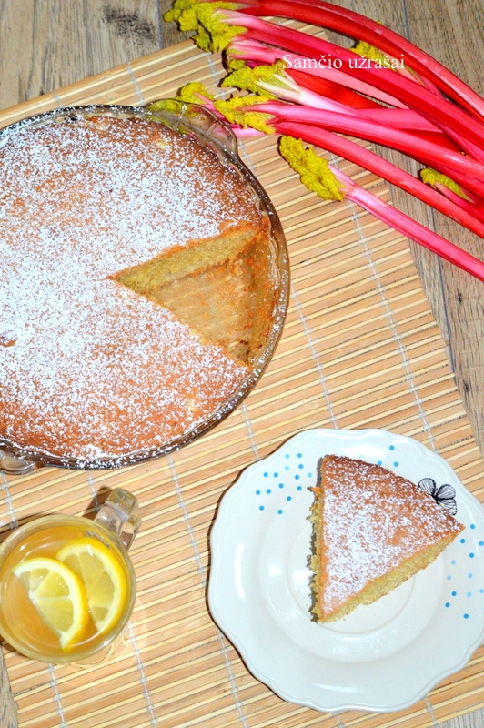 Suberkite į tešlą nuluptus ir plonomis juostelėmis supjaustytus rabarbarus. Šaukštu gerai išmaišykite.