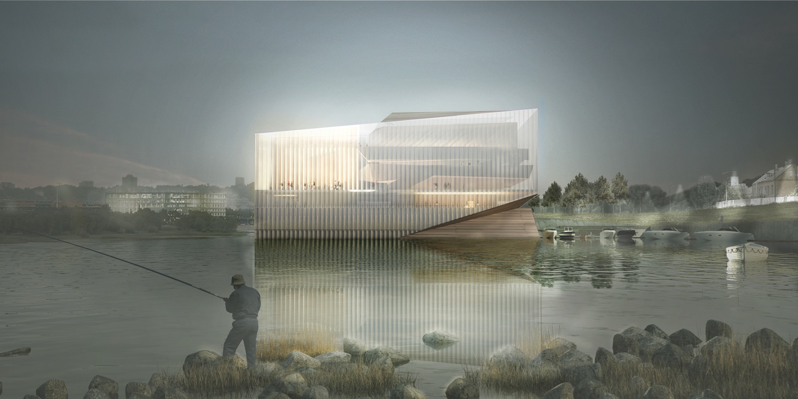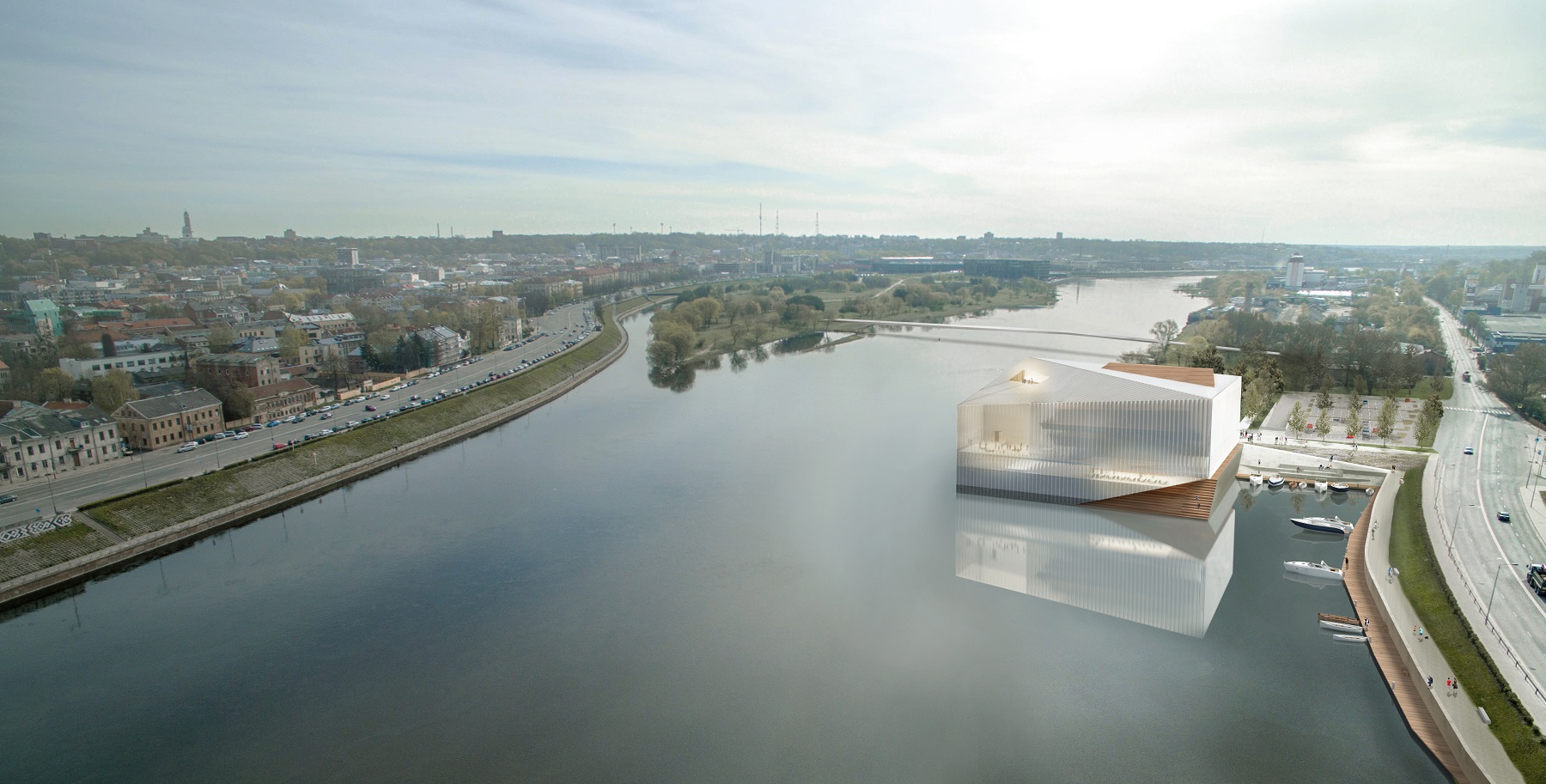 Skaidrus banguotas fasadas atkartoja upės vandens atspindžius. Iš vidaus lankytojams taip pat atsivers gyvas ikoniško Kauno senamiesčio peizažas ir Nemuno tėkmės įrėminta vaizdinga panorama. Numatyta, kad greta pastato įsiterps ir jaukus mažųjų laivų uostas.