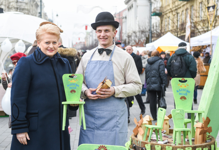 Mugėje Prezidentė įsigijo rankų darbo gaminių – verbų, trispalvių tulpių iš medžio, tautiniais raštais papuoštą juostą.