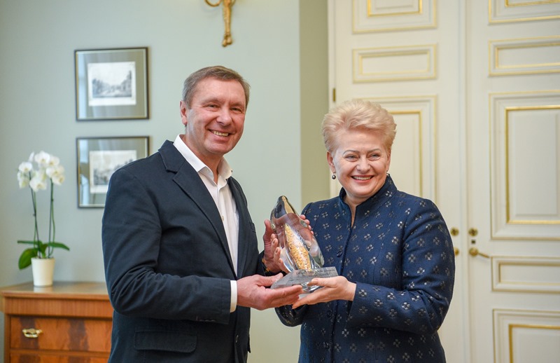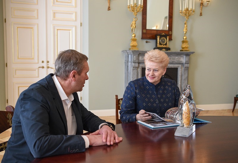 Susitikime sportininkas šalies vadovei įteikė specialiai Valstybės atkūrimo šimtmečiui sukurtą stiklo dirbinį, papuoštą šimtu gintaro gabalėlių, – tokį patį, kokį V. Urbonas paliko ir Nepalo Tiličo ežero dugne.