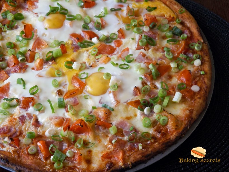 Iškočiokite skritulio formos picos tešlą ir dėkite į picos kepimo formą. Tešlą aptepkite pomidorų pasta. Tuo metu apkepkite šoninę ir supjaustykite mažais gabaliukais. Ant picos viršaus dėkite tarkuotą čederio sūrį, mocarelą, šoninę, smulkiai supjaustytus pomidorus. Pabaigoje įmuškite 4 kiaušinius.