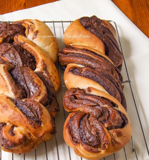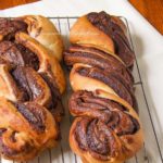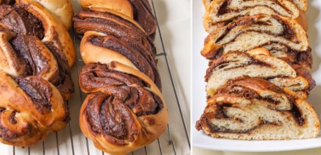 - Kai tešla pakils, padalykite ją į dvi dalis ir iš kiekvienos dalies iškočiokite 20 cm pločio stačiakampį. Ištepkite „Nutellos“ kremu, palikdami kraštus per piršto storumą nepateptus. Suvyniokite į vyniotinį pradėdami vynioti nuo ilgosios dalies. Perpjaukite vyniotinį išilgai, tik palikite viršutinę dalį neperpjautą, kad būtų lengviau suvynioti. Tada susukite į pynę. Užtvirtinkite galus.