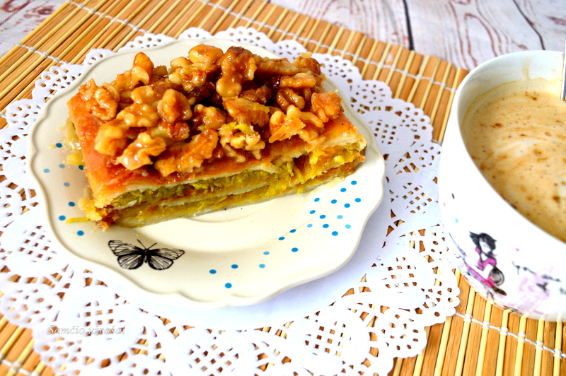 Imame tešlos lakštą (aš formavau silikoninėje formoje), jei tešla išsipūtusi – paspaudžiame, kad sukristų, ir aptepame puse obuolių masės. Uždedame antrą tešlos lakštą, šiek tiek paspaudžiame ir dedame likusią obuolių masę. Klojame trečią tešlos sluoksnį ir dedame riešutų masę.