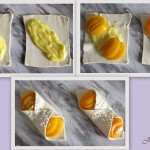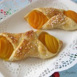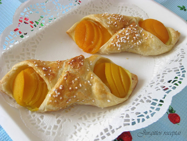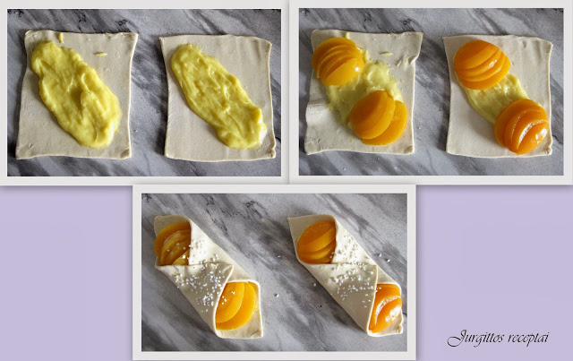 Pyragaičių formavimas. Persikų puseles perpjauname vertikaliai per pusę (aš supjausčiau skiltelėmis, bet nepatarčiau to daryti, nes kepant jos atsiskyrė viena nuo kitos ir ėmė lįsti lauk iš pyragaičių). Tešlą supjaustome 10–12 cm kvadratais. Įstrižai per vidurį tepame šaukštą kremo. Kampuose vieną priešais kitą (ant kremo) dedame po pusę persiko puselės. Priešingus kampus lenkiame vieną ant kito, patepę juos plaktu kiaušiniu, kad suliptų. Viršų aptepame plaktu kiaušiniu, pabarstome perliniu cukrumi. Kepame iki 200 °C įkaitintoje orkaitėje apie 20 min. (arba kol pyragaičiai išsipučia ir viršus gražiai paruduoja). Skanaus!