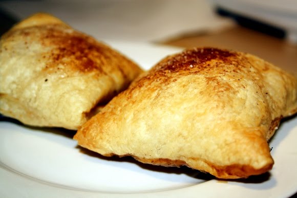 Sluoksniuotos tešlos lakštus supjaustyti į keturias dalis. Ant miltuoto paviršiaus pakočioti, kol kiekviena dalis bus kvadratinė. Į kiekvieno kvadrato vidurį įdėti virto obuolių įdaro ir užlankstyti kraštus. Viršų patepti pienu ir pabarstyti cinamono ir cukraus mišiniu.