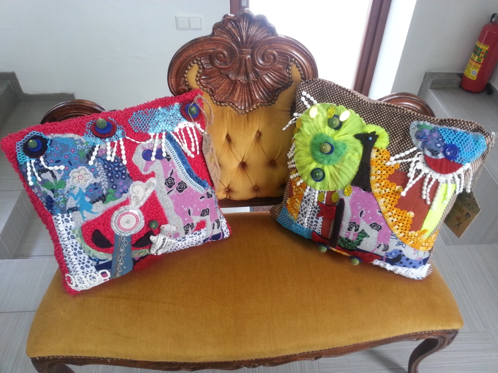 Grįždama iš butiko namo, užsukau į pigių drabužių parduotuvę ir nusipirkau medžiagų gamybai: juk nepradėsi bandyti nuo šilko tekstilės. Taip gimė mano pirmosios pagalvėlės, kurtos koliažo technika. Kirpau detales iš vienur, kitur, dėliojau skirtingų faktūrų audinius, lipdžiau piešinius, kaip kregždutės iš molio lipdo lizdelį… Viską dariau rankomis, nes namie net siuvimo mašinos neturiu. Patiko. Greitai namai apaugo pagalvėlių stirtomis. O kas toliau? Neapsikentusi čiupau vieną, ištraukiau kamšalą, prisiuvau rankenas – rankinė! Taip ir prasidėjo… Draugės suvedė su nuostabia siuvėja Dalyte – ir iki šiol dirbame duetu (ji rūpinasi technine darbo dalimi).