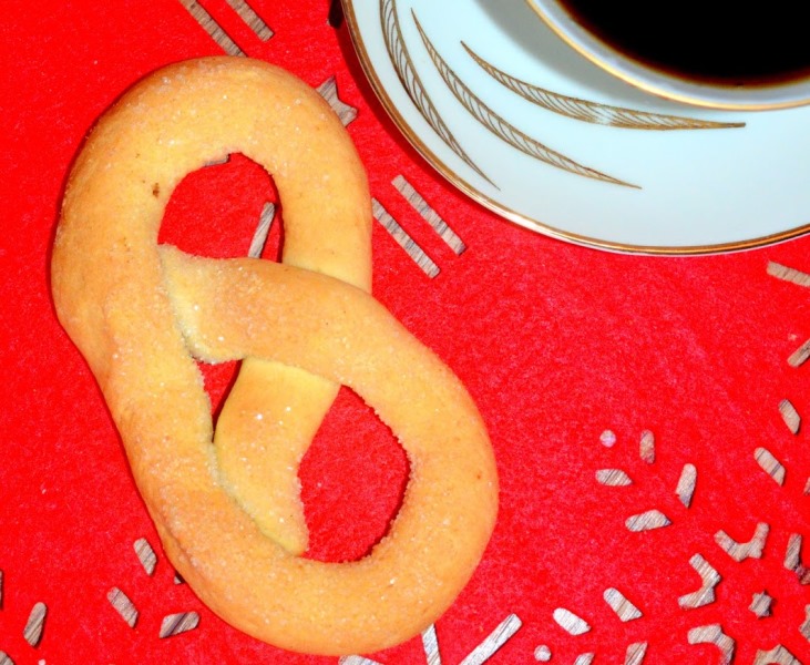 Atgnybti tešlos gabalėlį ir padaryti nestorą, pailgą virvelę, suraityti riestainį, kaip nuotraukoje, ir vieną riestainio pusę apiberti cukrumi.