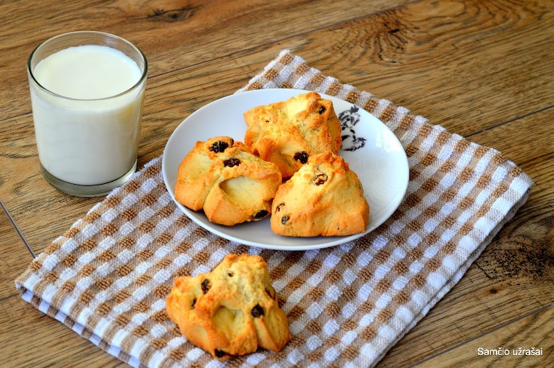 Sumaišykite miltus, cukrų ir kepimo miltelius. Į miltus sudėkite kubeliais pjaustytą sviestą ir trinkite rankomis, kol susidarys trupiniai. Sudėkite razinas ir patrinkite dar.