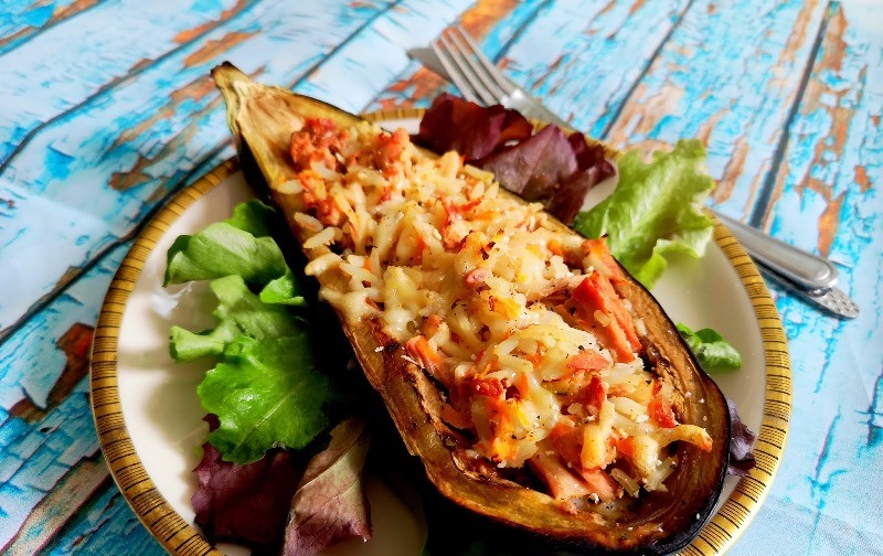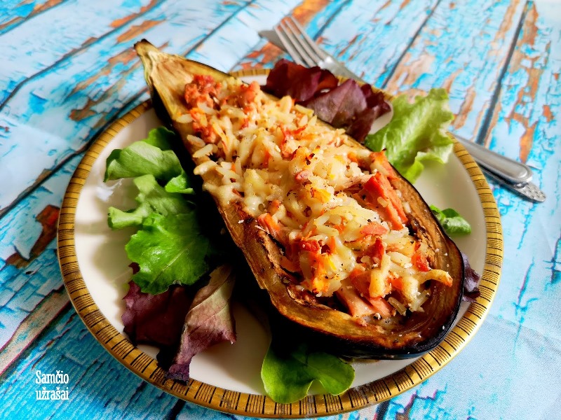 Iš orkaitės išimtus baklažanus įdarykite pasiruoštu įdaru ir kepkite orkaitėje dar apie 15 min.
