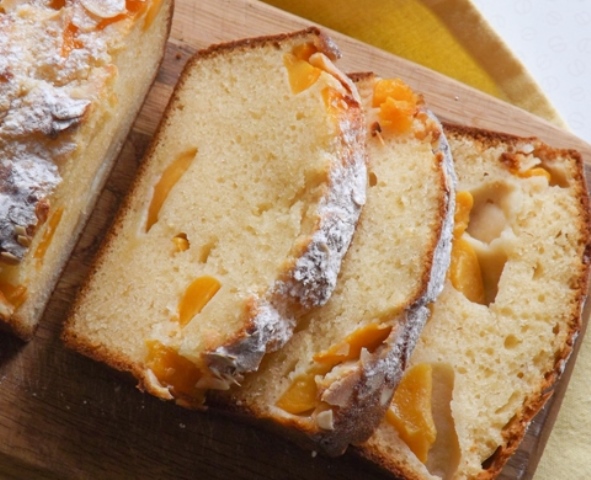 Orkaitę įkaitinkite iki 190 °C, riebalais patepkite ir kepimo popieriumi išklokite kepimo formą. Sviestą išlydykite, atidėkite į šalį. Miltus, kepimo miltelius, druską sumaišykite dubenėlyje. Atidėkite į šalį. Kiaušinius plakite, kol ims putoti. Tada supilkite saldintą sutirštintą pieną, vanilę, išplakite. Įmaišykite pravėsusį lydytą sviestą. Suberkite miltų mišinį, viską sumaišykite. Supilkite tešlą į formą. Ant viršaus išdėliokite griežinėliais supjaustytus persikus. Apibarstykite migdolų drožlėmis. Kepkite apie 50 minučių (tikrinkite mediniu pagaliuku).