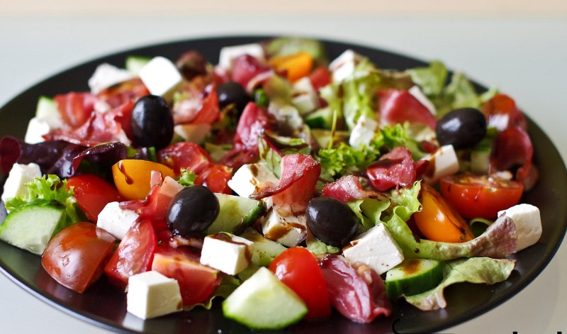 Dėkite supjaustytus pomidorus, agurkus, sūrį, uždėkite po keletą juodųjų alyvuogių. Pridėkite antienos filė.