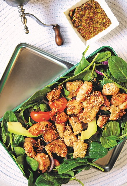 Vištieną supjaustykite kubeliais, apibarstykite druska, pipirais, įtarkuokite česnako. Suberkite sezamų sėklas ir įpilkite aliejaus. Viską išmaišykite. Įkaitinkite keptuvę, sudėkite vištieną ir kepkite ant lengvos kaitros, kol apskrus. Svogūną supjaustykite pusžiedžiais, pomidorus – skiltelėmis, avokadą – juostelėmis, agurką – griežinėliais.