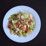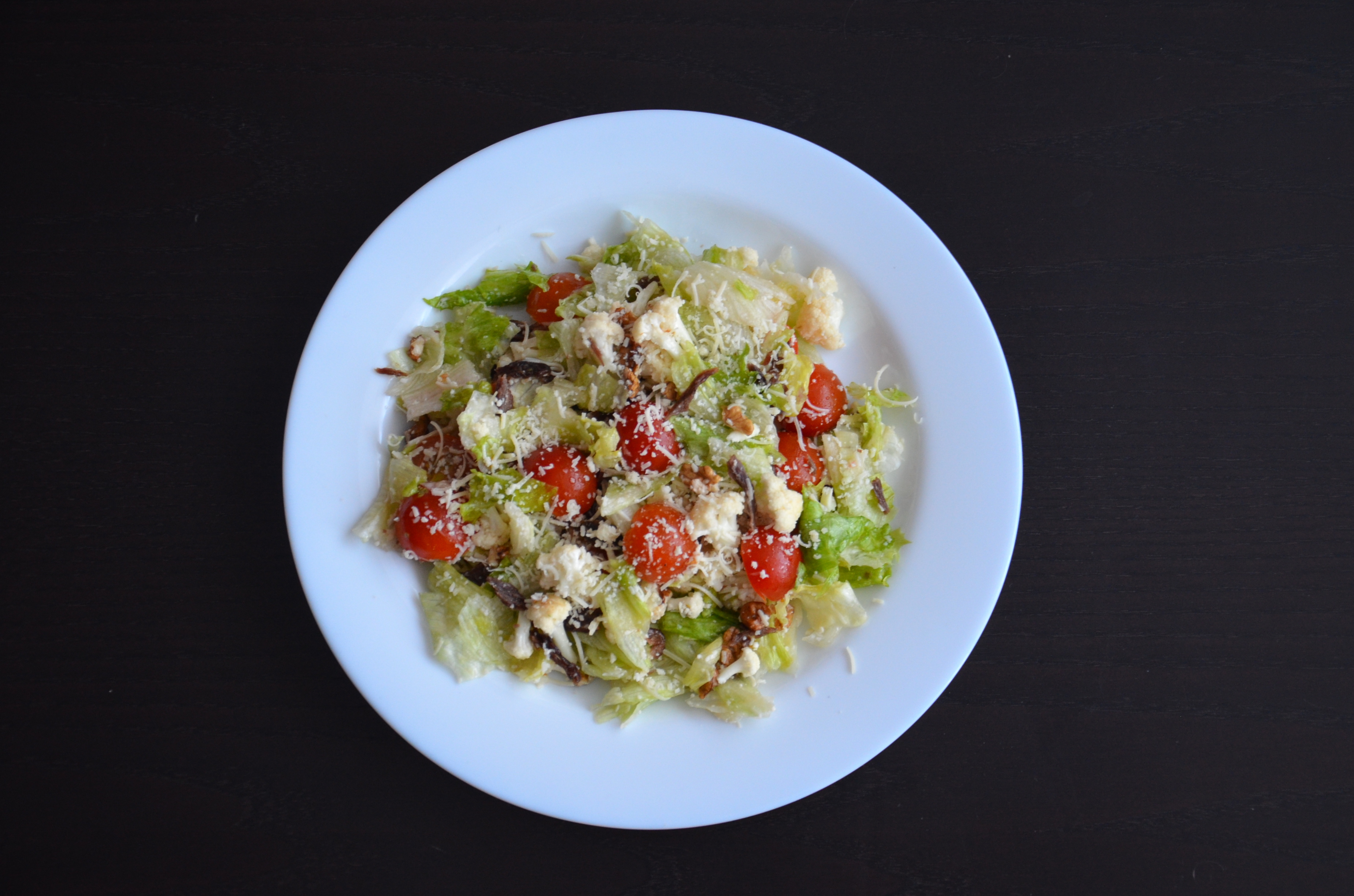 Salotų gūžė suplėšoma į maždaug 2 cm dydžio gabalėlius, jautienos gabaliukai susmulkinami, riešutai kiek irgi pasmulkinami, kekiniai pomidorai supjaustomi per pusę, žiedinis kopūstas taip pat susmulkinamas į maždaug 1 cm kekes. Visi šie produktai sumaišomi. Tuomet salotos išdėliojamos į lėkštes, užpilamos padažu, apibarstomos tarkuotu sūriu ir patiekiamos.
