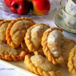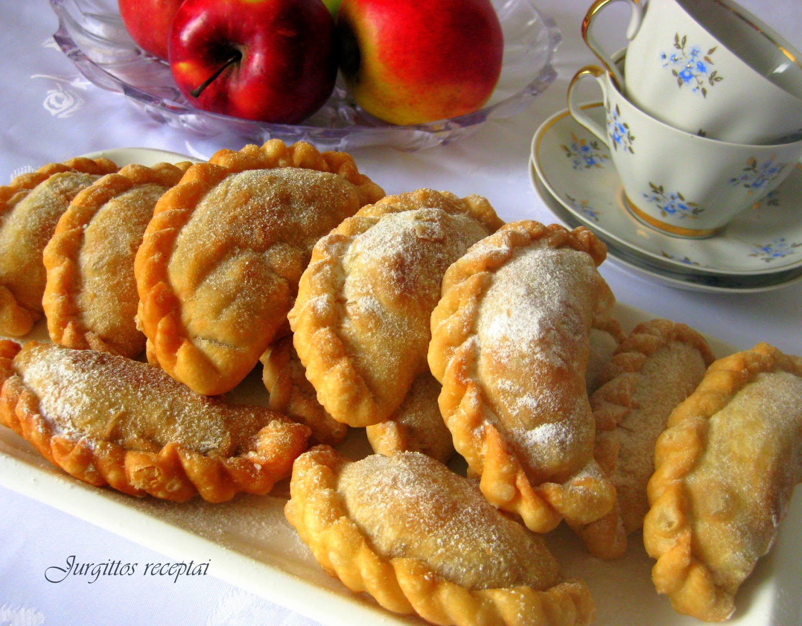 Formavimas. Tešlą padalijame į 20 dalių. Iškočiojame iš tešlos gabaliuko ploną skritulį (apie 8–9 cm), dedame įdaro, kraštus stipriai suspaudžiame ir suvyniojame kraštą į kaselę. Puode įkaitiname aliejų (jo reikia tiek, kad apsemtų pyragėlius ir jie virtų kaip spurgos) ir pavartydami verdame, kol gražiai pagelsta. Atvėsusius pabarstome milteliniu cukrumi. Skanaus!