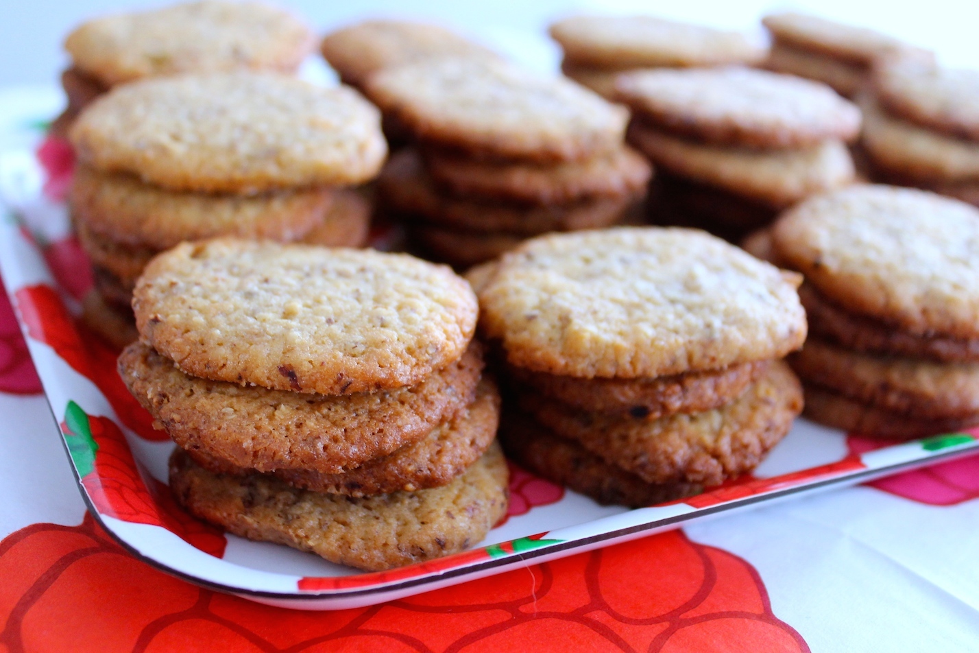 Sausainiai trapūs ir aromatingi. Kuo plonesni, tuo skanesni. Puikus užkandis prie arbatos. Kitą kartą tik riešutus naudočiau be luobelių, kad skonis būtų kiek švelnesnis.
