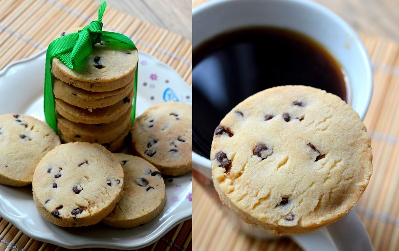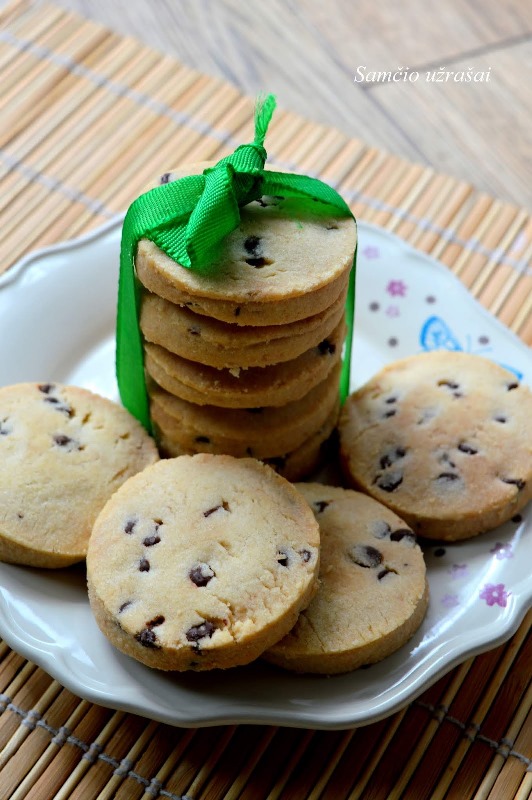 Ištrinkite sviestą su cukrumi iki purios masės. Suberkite miltus, šokolado lašelius ir išminkykite tešlą. Tešlą iškočiokite 1 cm storio. Išspauskite apskritus sausainukus ir sudėkite į kepimo skardą. Šaldytuve laikykite 20 min.