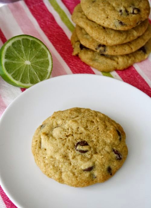 Dubenyje sumaišome miltus, sodą ir druską. Kitame dubenyje sudedame sviestą, beriame rudąjį cukrų ir baltąjį cukrų, plakame elektriniu plaktuvu iki purios kreminės masės. Įmaišome kiaušinį ir trynį, išplakame. Įmaišome vanilės ekstraktą, žaliosios citrinos žievelę ir sultis. Išplakame iki vientisos masės.