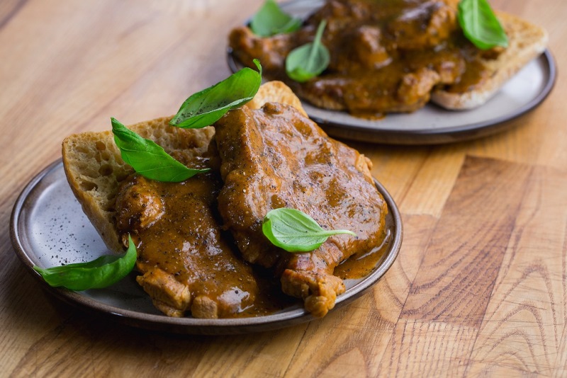 Troškintuve ant didelės kaitros alyvuogių aliejuje pakepinti pusžiedžiais smulkintus svogūnus. Kai jie tampa skaidrūs, suberti smulkiais kubeliais supjaustytą moliūgą. Kai moliūgas apskrunda, užpilti daržoves samčiu kitame puode paruošto sultinio. Sumažinti kaitrą, pamaišyti, trumpai patroškinti ir vėl užpilti sultiniu, kad apsemtų visas daržoves. Troškinti apie 10 minučių. Nukelti nuo viryklės ir sutrinti. Riekelėmis supjaustytą kiaulienos sprandinę apkepinti su prieskonių mišiniu ant didelės kaitros. Užpilti samčiu sultinio, sumažinti kaitrą ir pakepinti 5 minutes kelis kartus apverčiant mėsą. Tada supilti moliūgo masę, uždengti ir troškinti nuo 40 iki 60 minučių, priklausomai nuo to, kokio minkštumo mėsą mėgstate. Pabaigoje, jeigu padažas per skystas, išimti mėsą, padidinti kaitrą ir pakaitinti 5 minutes, kol padažas sutirštės. Patiekti su skrudinta duona arba bulvėmis ar kitokiu mėgstamu garnyru. Skanaus! |