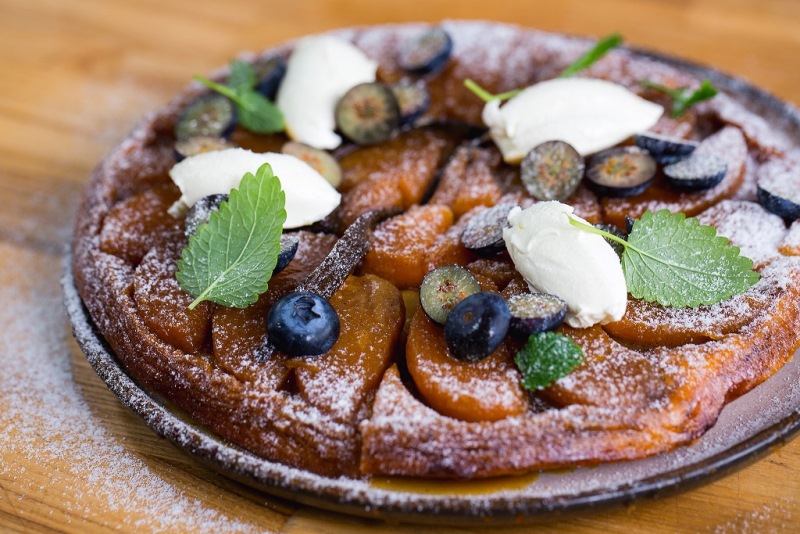 Obuolius nulupti ir supjaustyti maždaug 1 cm storio skiltelėmis. Į įkaitintą keptuvę po truputį berti cukrų ir judinant keptuvę laukti, kol jis visas gražiai išsilydys. Tada po truputį dėti kambario temperatūros sviesto gabaliukus ir nuolat maišyti, kol visiškai ištirps ir susidarys vientisa masė. Į gautą masę sudėti obuolių skilteles, gerai išmaišyti. Vanilės ankštį perpjauti išilgai ir išskobti sėklytes, viską sudėti į keptuvę ir gerai išmaišyti. Kol obuoliai karamelizuojasi, gražiai juos paskirstyti ant keptuvės dugno saulytės forma, iškočioti tešlą ir išpjauti keptuvės skersmens skritulį. Juo uždengti karamelizuotus obuolius, tolygiai subadyti tešlos paviršių šakute ir kepti iki 180 °C temperatūros įkaitintoje orkaitėje apie 20–30 minučių. Iškepusį pyragą geriausia palikti nakčiai pastovėti, kad sustandėtų karamelizuotų obuolių masė. Prieš patiekiant dekoruoti maskarponės sūrio rutuliukais, šviežiomis šilauogėmis, mėtos lapeliais ir apibarstyti milteliniu cukrumi. Skanaus! |