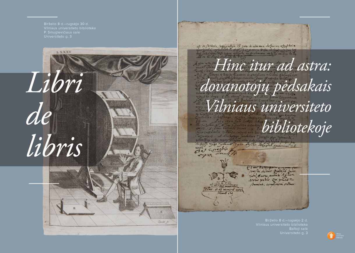 2016-uosius metus Lietuvos Respublikos Seimas yra paskelbęs Bibliotekų metais. Siekdama paminėti šį įvykį VU biblioteka pristatys net dvi įsimintinas parodas, skirtas mecenatystei ir bibliotekų istorijai. Tad jau birželio 8 d. 16 val. visi maloniai kviečiami atvykti į parodų „Libri de libris“ („Knygos apie knygas“) ir „Hinc itur ad astra: dovanotojų pėdsakais Vilniaus universiteto bibliotekoje“ atidarymą bibliotekos P. Smuglevičiaus salėje.