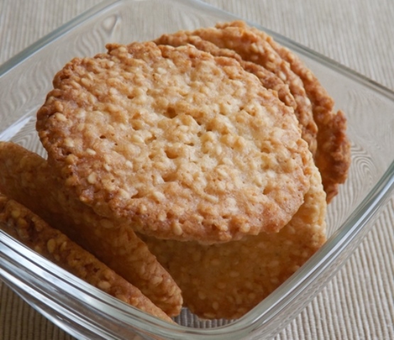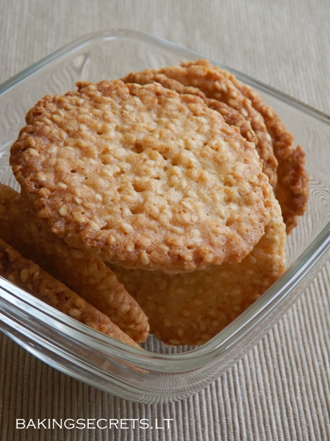 Dėkite sezamų sėklas, cukrų, lydytą sviestą, berkite miltus, viską išmaišykite.